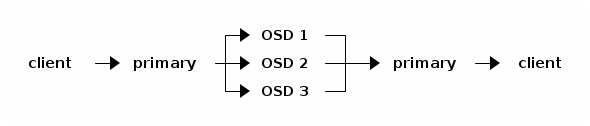 目前,纠删码池中的所有读取都定向到每个 PG 的主 OSD。对于小型(子块)读取,这将导致以下消息流: