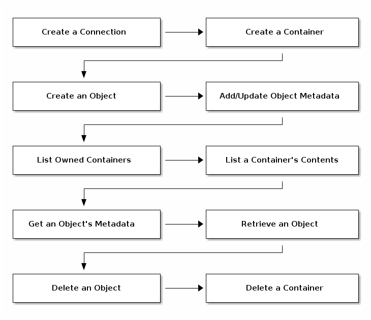 与 Swift 兼容的 API 教程遵循一个简单的基于容器的对象生命周期。第一步要求您在客户端和 RADOS 网关服务器之间建立连接。然后,您可以遵循自然的容器和对象生命周期,包括添加和检索对象元数据。请参阅以下语言的示例代码
