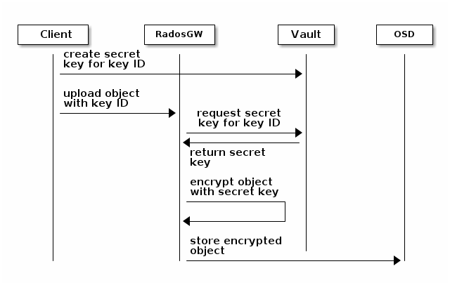 对象网关将从 Vault 获取密钥,加密对象并将其存储在存储桶中。任何下载对象的请求都将使对象网关自动从 Vault 检索相应的密钥并解密对象。